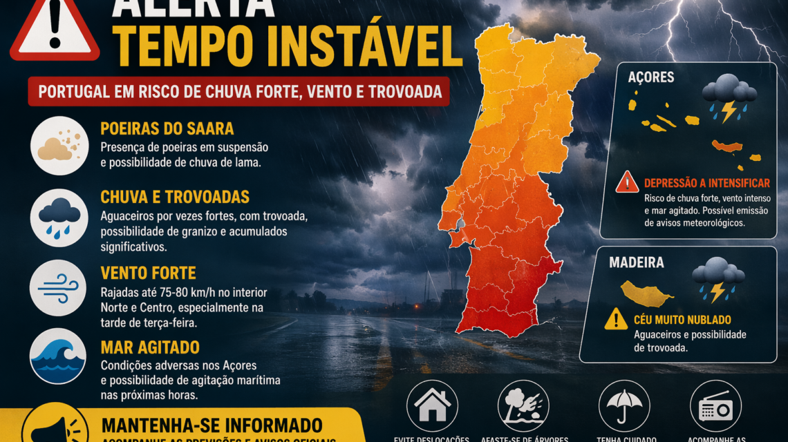 Depois de vários dias de tempo estável e temperaturas acima do habitual para esta altura do ano, o estado do tempo em Portugal deverá sofrer alterações significativas nos próximos dias. As previsões apontam para a chegada de poeiras em suspensão, chuva, possibilidade de trovoadas e um agravamento das condições meteorológicas tanto no Continente como nas regiões autónomas da Madeira e dos Açores.